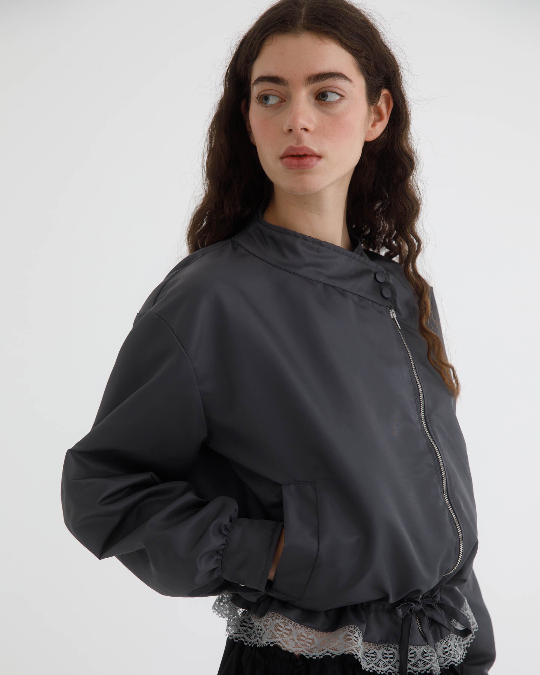 The jacket is lined with viscose, a fiber derived from cotton, which gives the interior a smooth, soft feel against the skin. A lace trim detail is applied along the lower edge of the lining, visible at the hem.