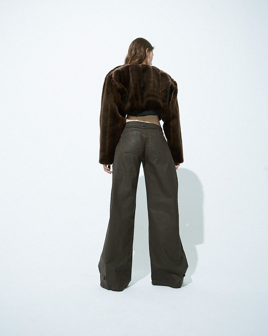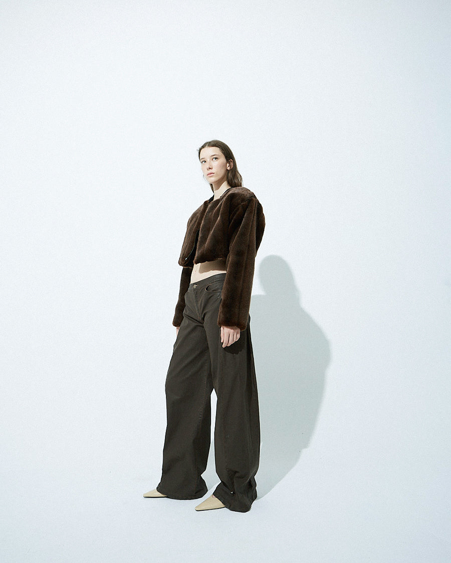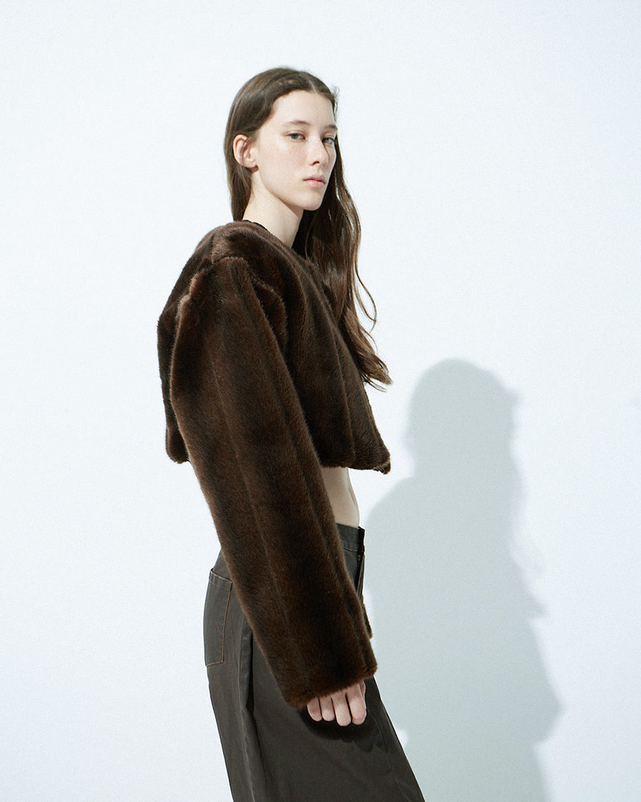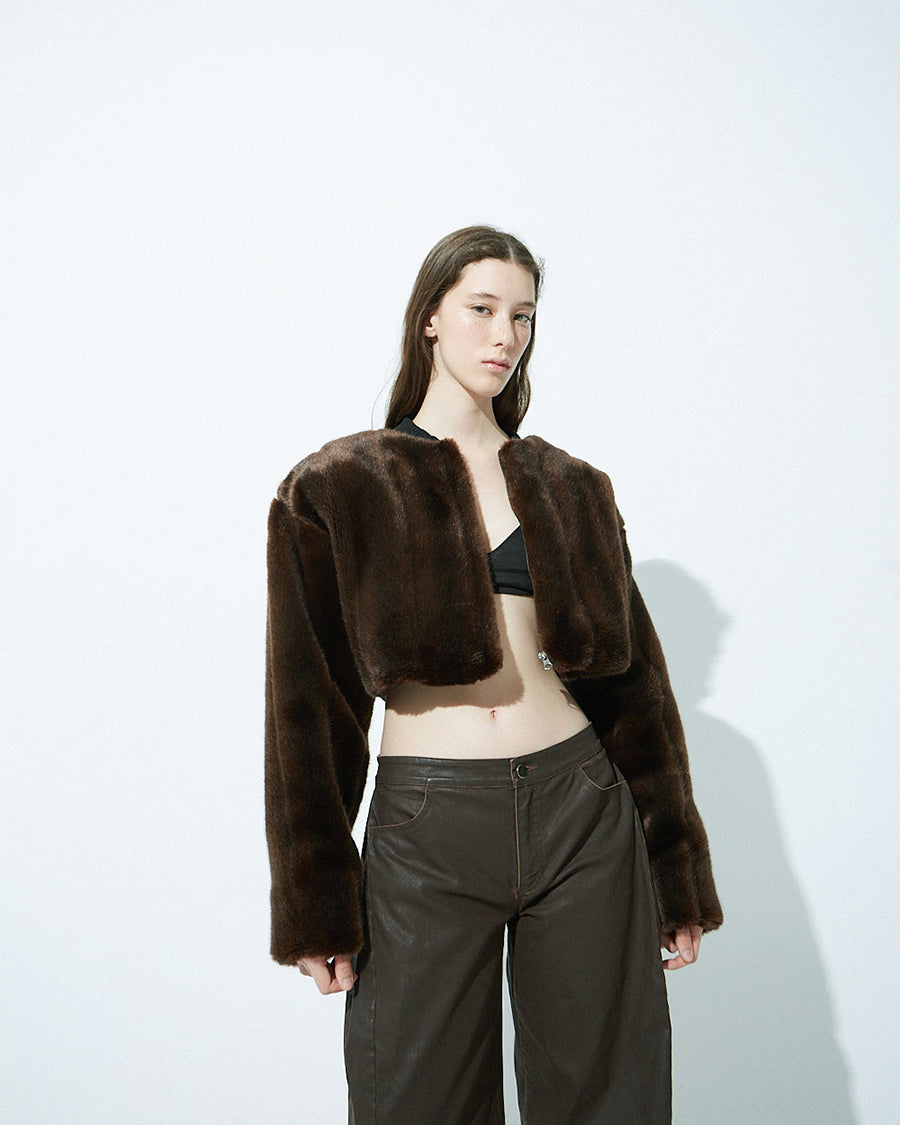 Cropped bomber made in vegan fur - mink like, with big shoulder pads.