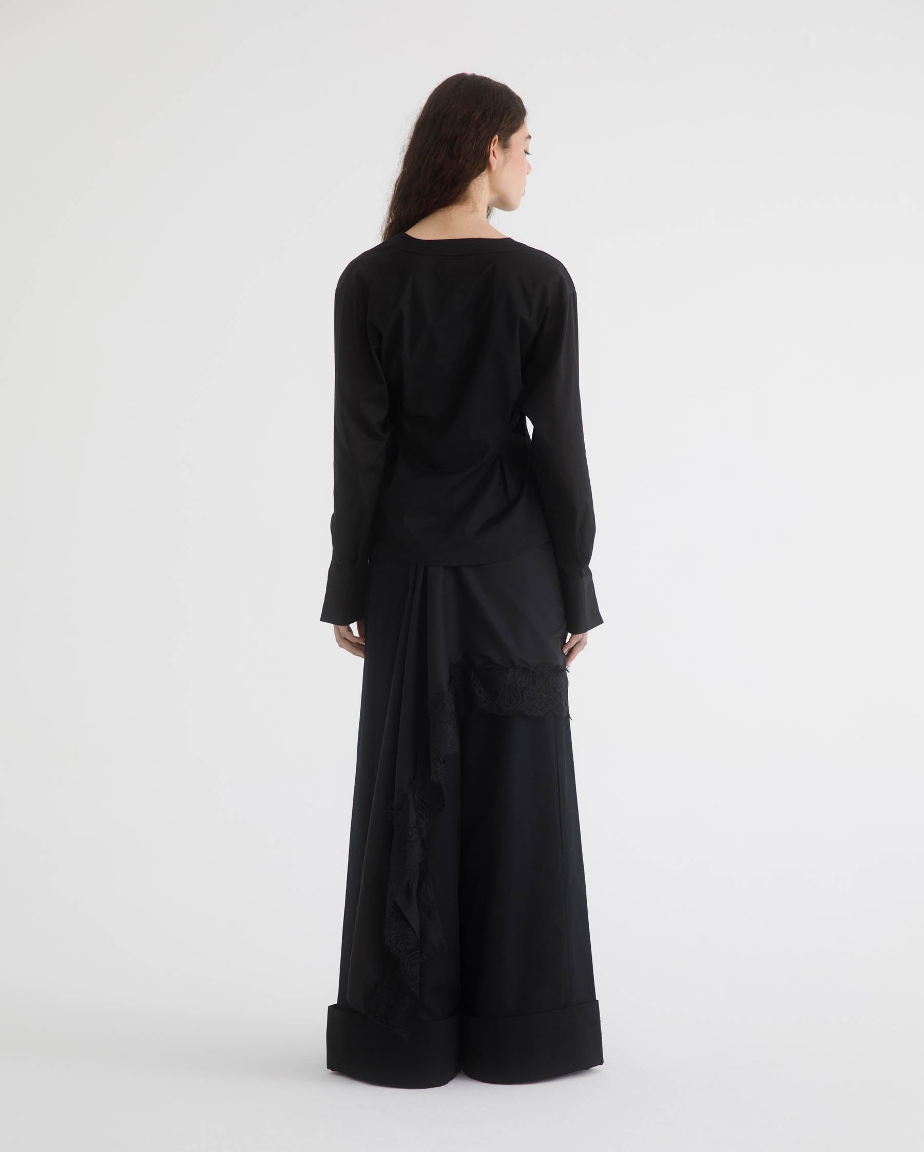 Finished with wide cuffed hems, these pants have a clean, defined edge and a strong visual weight at the bottom.