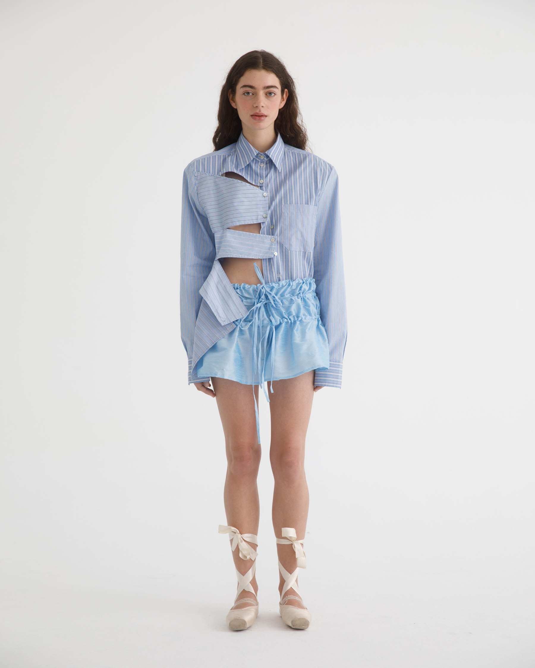 The skirt sits at the waist and falls short on the leg, with gathered panels that create a flexible, adjustable shape.