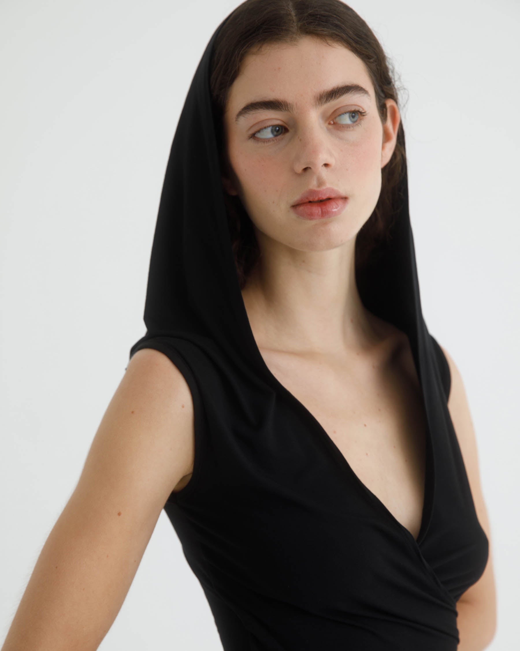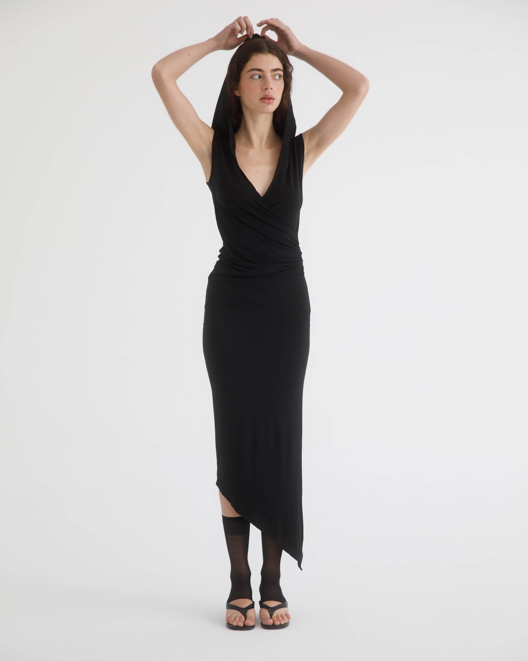 Hooded dress made from soft bamboo fabric. Designed with a fitted, wrapped bodice and a deep V neckline. The skirt falls straight with an asymmetrical hem.